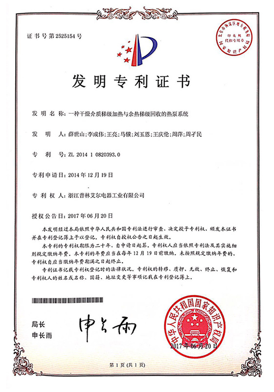 2017年一種干燥介質梯級加熱與余熱梯級回收的熱泵系統發明專利證書