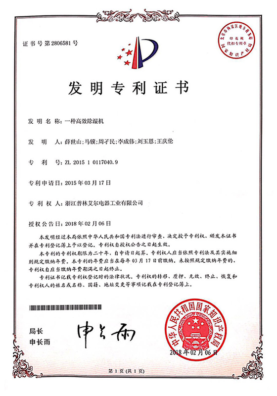 2018年一種高效除濕機發明專利證書