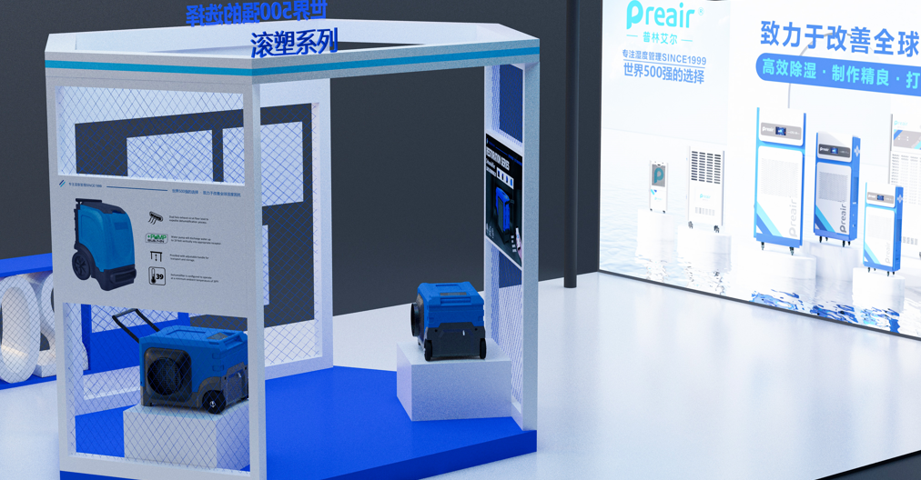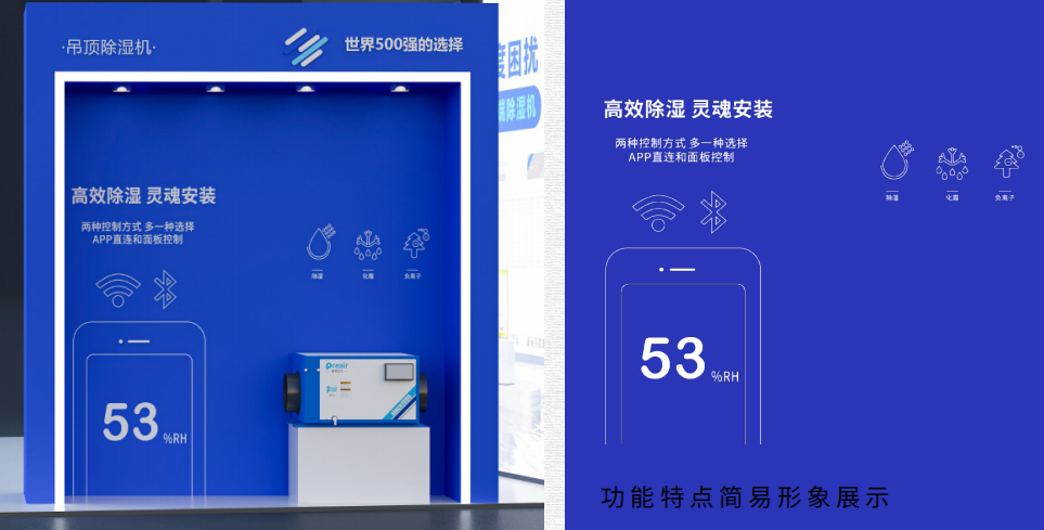 對(duì)于占比最大的兩塊燈箱海報(bào),將本次參展的全系列機(jī)型( 不包含外貿(mào)機(jī)型)靜態(tài)集中展示,配合品牌的主打廣告語和使命愿景,讓來展臺(tái)的觀眾,一下就能關(guān)注到我司的使命:普林艾爾——致力于改善全球濕度困擾。