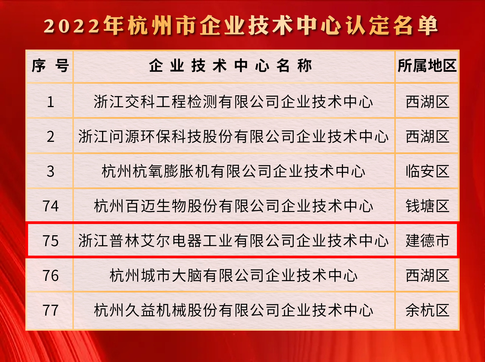 浙江普林艾爾電器工業有有限公司榮獲“2022年杭州市企業技術中心”認定。