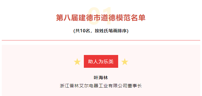 據了解,本屆道德模范共分助人為樂、敬業奉獻、誠實守信、孝老愛親、見義勇為5類,浙江普林艾爾電器工業有限公司董事長葉海林先生榮獲本屆助人為樂類“建德市道德模范”稱號。